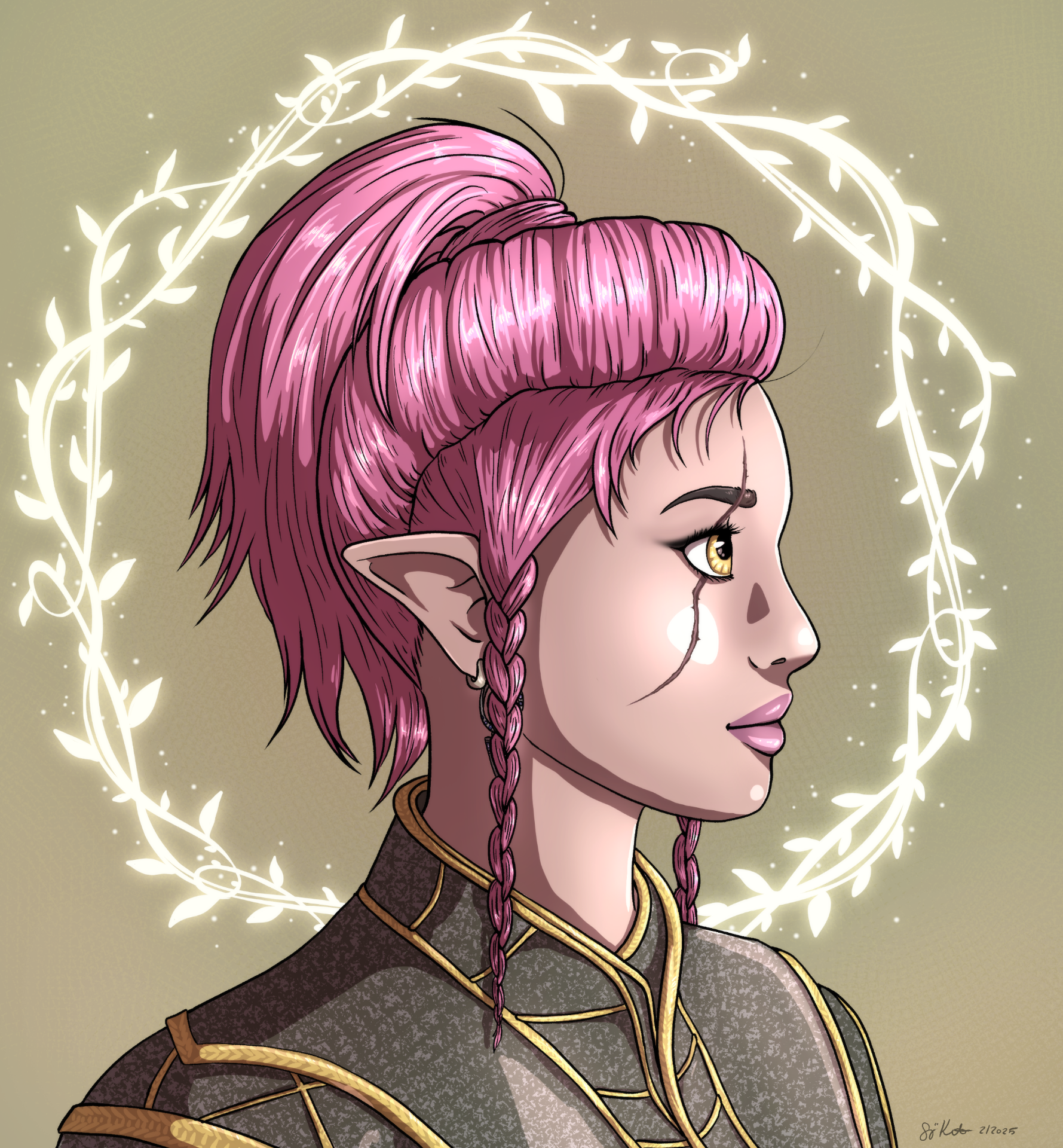 Väritetty, yksityiskohtaisesti varjostettu kuva hahmosta.